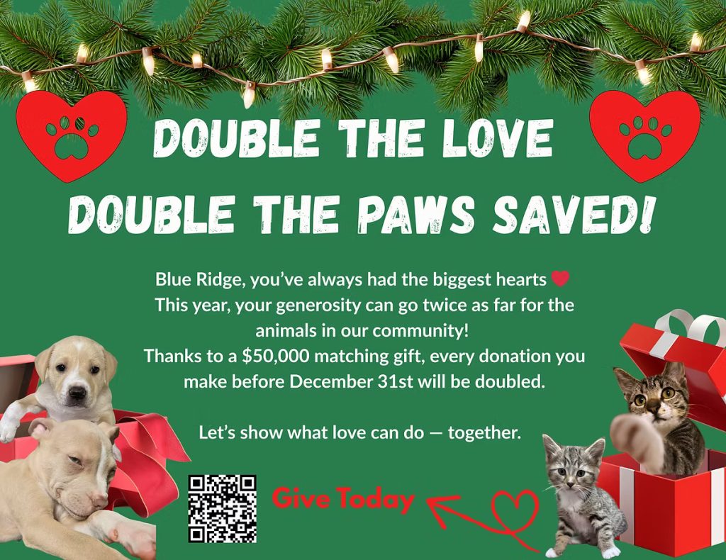 Right now, your support counts twice. A $100 gift becomes $200. A $500 gift becomes $1,000 — all helping us move closer to reaching our $100,000 matching goal for the animals of Blue Ridge.
